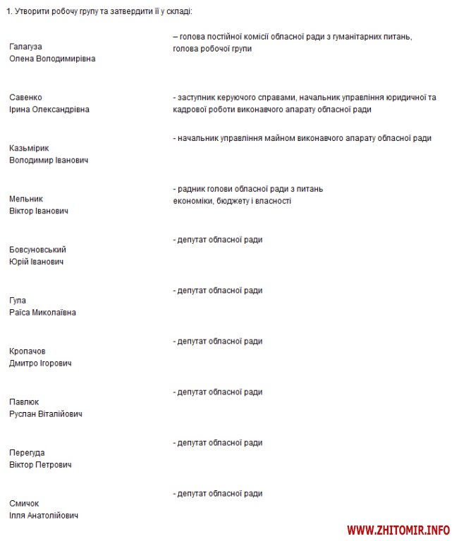 «Робочій групі вивчити ситуацію, що склалася на комунальному підприємстві «Житомирська обласна філармонія імені Святослава Ріхтера» Житомирської обласної ради та надати інформацію до 1 липня 2016 року. Контроль за виконанням розпорядження покласти на першого заступника голови обласної ради Ширму В.В.», - йдеться у розпорядженні.