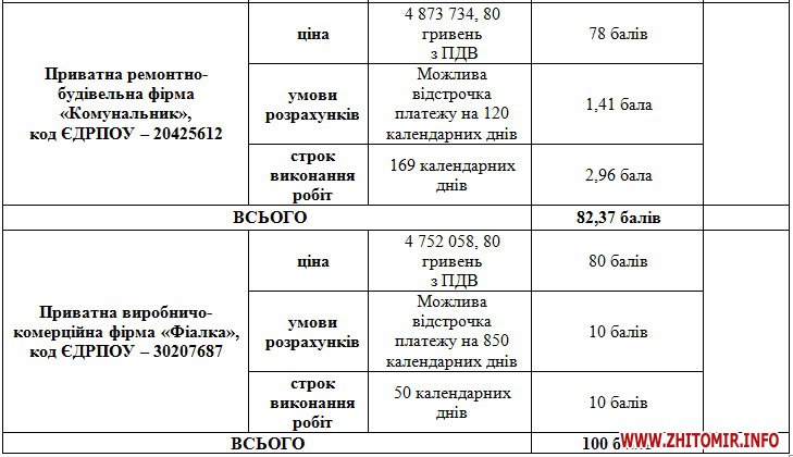 Конкурентами рівненчан були фірми «Комунальник» з Житомира та «Урарту» з м. Баранівка Житомирської області. Пропозиція останньої була відхилена у зв’язку з невідповідністю документації.