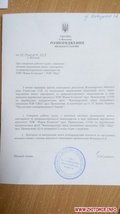 Розпорядження «Про створення робочої групи з вивчення питання дотримання вимог санітарного та природоохоронного законодавства ТОВ «Фірма Естрелла» і ТОВ «Обіо» 5 липня 2016 року підписав мер Житомира Сергій Сухомлин.