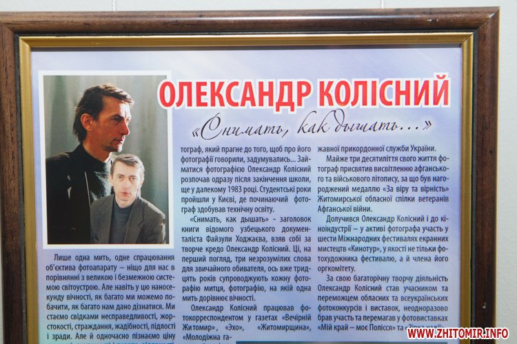 Довідково. Олександр Колісний — фотограф-документаліст, майстер підмічати деталі, невидимі для пересічної людини. Він працював фотокореспондентом у газетах «Вечірній Житомир», «Эхо», «Молодіжна газета», «Житомирщина», його світлини часто публікувалися на шпальтах «Голосу України» та «Урядового кур’єра». У творчому доробку митця ювілейний фоліант банку «Аваль», фото для презентаційного видання «Кордон» Державної прикордонної служби України.