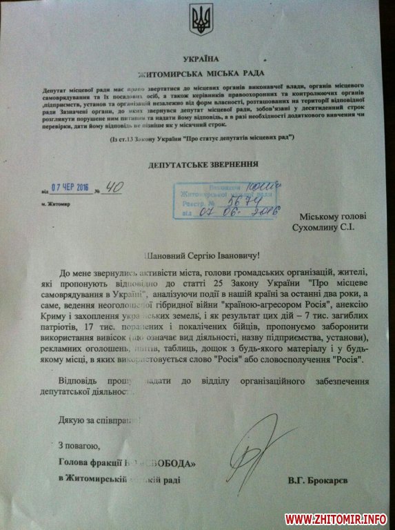 13 липня депутат Житомирської міськради, свободівець Віктор Брокарєв отримав відповідь на депутатське звернення стосовно заборони розміщення рекламних засобів, в яких використовується слово «Росія».