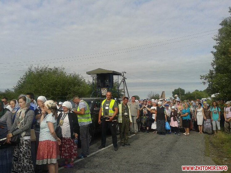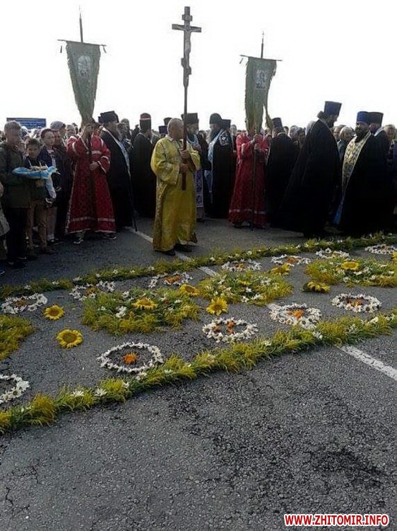 У Романівському районі, на кордоні Хмельницької та Житомирської областей, ходу з Почаївською іконою Божої Матері зустрічають близько 300 прочан, дорогу встелили орнаментом з квітів, автомобілі об’їжджають процесію по узбіччю.