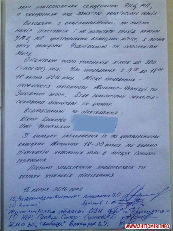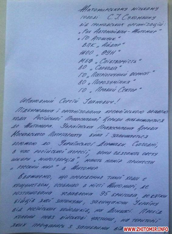 «…Вважаємо, що проходження такої ходи є кощунством, особливо в місті Житомирі, де розташована славетна 95 бригада, десятки бійців якої загинули, захищаючи Україну від російських бойовиків на Донбасі. Прохід колони повз військові частини, на території яких прощались з загиблими від рук агресорів, яких благословляли священники УПЦ МП, є знущанням над пам’яттю українських героїв. Виходячи з вищевикладеного, ми маємо намір пікетувати і не допустити прохід колони УПЦ МП центральними вулицями міста, в першу чергу вулицями Чуднівською та Проспектом Миру. Орієнтовне число учасників пікету до 300 (трьохсот) осіб. Час проведення з 9.00 до 18.00 18 липня 2016 року. Місце проведення перехрестя автодороги Житомир-Чернівці та Західного шосе… У випадку проходження їх центральними вулицями Житомира 18-20 липня, ми будемо пікетувати учасників ходи у місцях їхнього скупчення», – йдеться в листі.