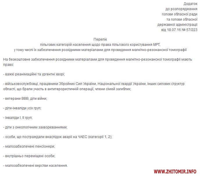 «Затвердити перелік пільгових категорій населення щодо права пільгового користування МРТ, у тому числі їх забезпечення розхідними матеріалами для проведення магнітно-резонансної томографії (додається). Управлінню охорони здоров’я обласної державної адміністрації у місячний термін розробити Положення про використання розхідних матеріалів для проведення МРТ пільговим категоріям населення. Контроль за виконанням розпорядження залишаємо за собою», - йдеться у документі, опублікованому на сайті обласної ради.