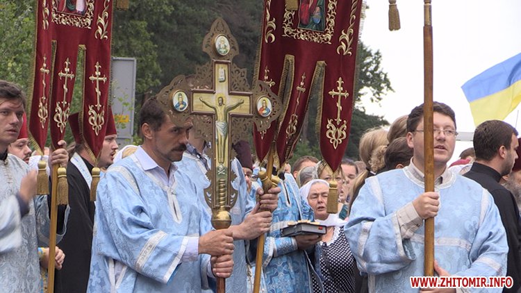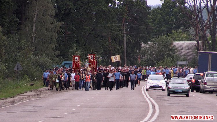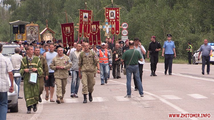 За кілька хвилин з’являються перші учасники хресної ходи УПЦ МП. Попереду йдуть священники, які на руках несуть ікони. Усього участь у ході взяло кілька сотень людей. В цей самий час на дорогу вийшли активісти, які тримали у руках національні символи та червоно-чорні прапори. Після короткої промови архієпископа Житомирського і Новоград-Волинського Никодима, який привітав учасників хресної ходи, віряни звернули в бік Західного шосе та продовжили свій рух. Безпеку їм забезпечили житомирські правоохоронці. За словами начальника ГУ Нацполіції в Житомирській області В’ячеслава Печененка завдяки співпраці з священниками та активістами вдалось уникнути буд-яких провокацій.