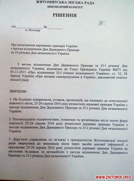 Рішення «Про розміщення державних прапорів України з нагоди відзначення Дня Державного Прапора та 25-ї річниці Дня незалежності України» підтримали члени виконкому Житомирської міськради 20 липня.
