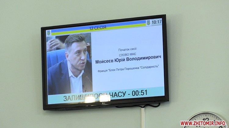 У Житомирській міській раді 21 липня депутати посварилися через пропозицію голови фракції Блоку Петра Порошенка. Юрій Мойсеєв дорікнув депутатам, які не ходять на депутатські комісії, а годинами обговорюють питання на пленарних засіданнях.