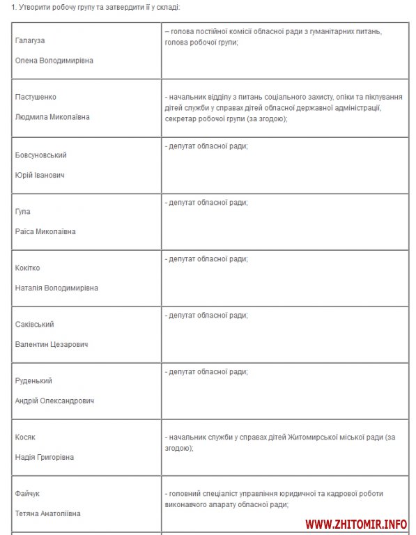 «На виконання рекомендацій постійної комісії обласної ради з гуманітарних питань від 30.06.16, з метою вивчення питання забезпечення житлом дітей-сиріт, дітей, позбавлених батьківського піклування, та осіб з їх числа утворити робочу групу. Робочій групі вивчити питання забезпечення житлом дітей-сиріт, дітей, позбавлених батьківського піклування, та осіб з їх числа. Контроль за виконанням розпорядження покласти на постійну комісію з гуманітарних питань», - йдеться у документі.
