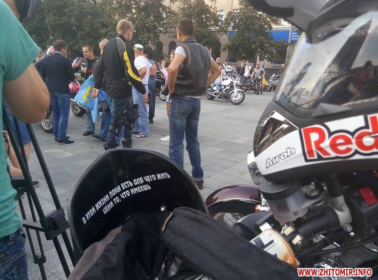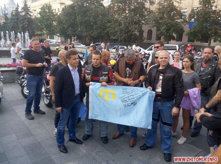 Близько 50 житомирських байкерів на кордоні області прийняли естафету від своїх колег з Рівного та привезли в обласний центр прапор кримськотатарського народу. Мотопробіг зустрічав мер Житомира Сергій Сухомлин, він залишив свій підпис на прапорі.