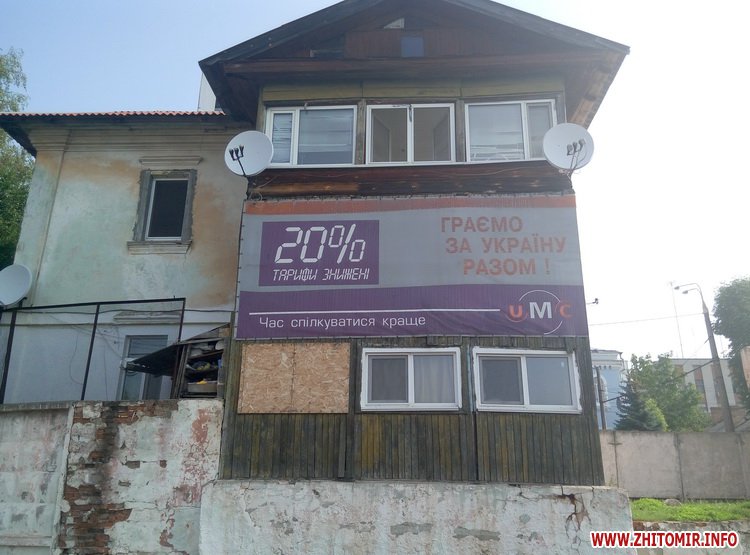 Журналисты Житомир.info увидели разрушенную восточную трибуну, ромашки на поле и рекламный банер на доме, который «залез» прямо на беговые дорожки.
