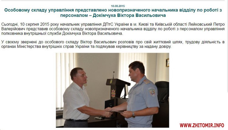 «1 серпня 2016 року заступник Голови Державної пенітенціарної служби України Сергій Миколайович Оміновський представив керівному складу органів та установ виконання покарань Житомирської області тимчасово виконуючого обов’язки начальника управління ДПтС України в області полковника внутрішньої служби Докімчука Віктора Васильовича. Заступник Голови ДПтС України побажав новопризначеному керівнику територіального управління успіхів у роботі та висловив впевненість у його підтримці та взаєморозумінні з боку співробітників органів та установ виконання покарань Житомирщини», - інформує сайт УДПтС.