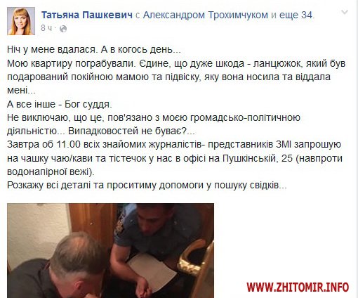 «Мою квартиру пограбували. Єдине, що дуже шкода - ланцюжок, який був подарований покійною мамою та підвіску, яку вона носила та віддала мені... А все інше - Бог суддя. Не виключаю, що це, пов'язано з моєю громадсько-політичною діяльністю... Випадковостей не буває?... Завтра об 11.00 всіх знайомих журналістів- представників ЗМІ запрошую на чашку чаю/кави та тістечок у нас в офісі на Пушкінській, 25 (навпроти водонапірної вежі). Розкажу всі деталі та проситиму допомоги у пошуку свідків», - написала Тетяна Пашкевич.