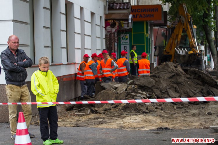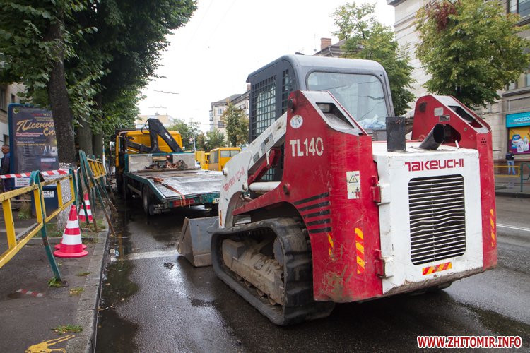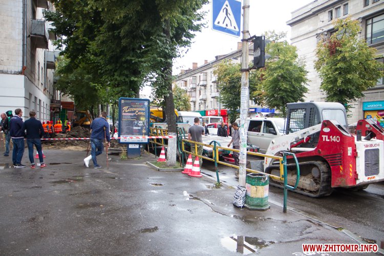 12 серпня у Житомирі на вулиці Київській, навпроти універмагу, розпочалася реконструкція тротуару. Будівельники знімають верхній шар асфальту, на дорозі стоїть спецтехніка, люди обходять будівництво по проїжджій частині.