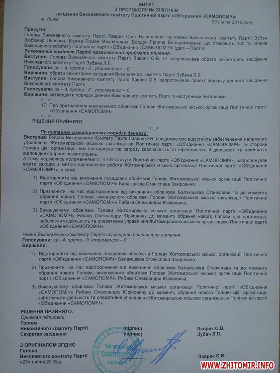 У розпорядженні Житомир.info є витяг з протоколу засідання виконавчого комітету політичної партії «Об’єднання «Самопоміч» від 23 липня 2016 року, в якому йдеться про прийняте рішення відсторонити від виконання посадових обов’язків голову житомирської міської організації політичної партії «Об’єднання «Самопоміч» Балакішієва Станіслава Закіровича та призначити виконуючим обов’язки голови Олександра Рибака до моменту обрання нового голови.
