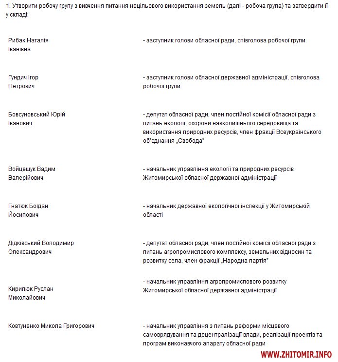 «Робочій групі: вивчити питання нецільового використання земель; залучати, у разі потреби, до роботи фахівців департаментів, управлінь Житомирської облдержадміністрації та виконавчого апарату Житомирської обласної ради; надати результати розгляду питання Житомирській обласній раді та Житомирській обласній державній адміністрації. Контроль за виконанням розпорядження залишаємо за собою», - йдеться у документі, опублікованому на сайті облради.