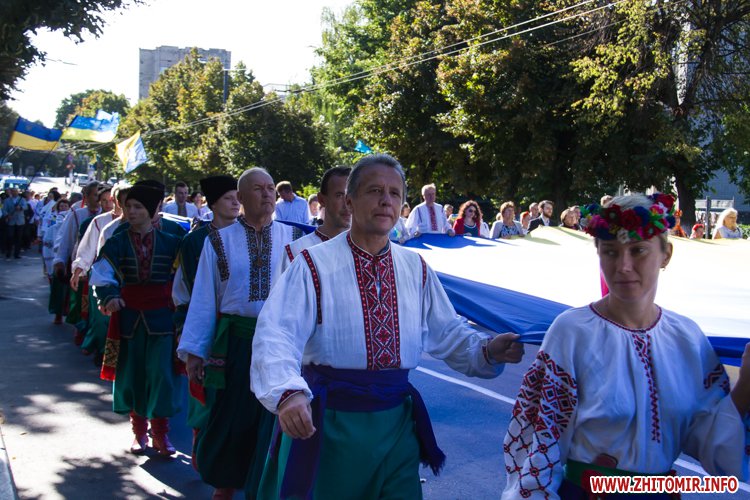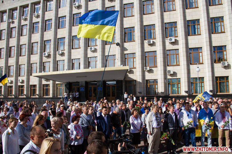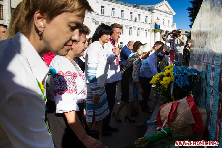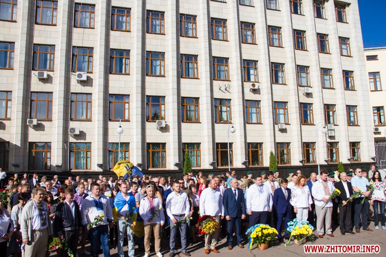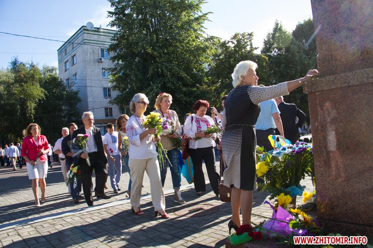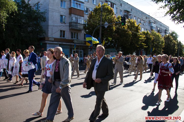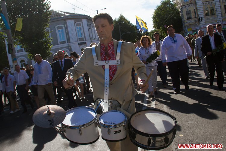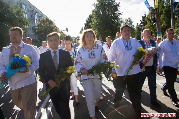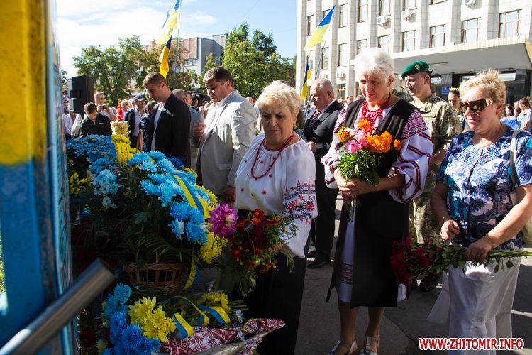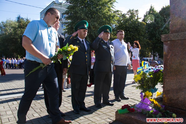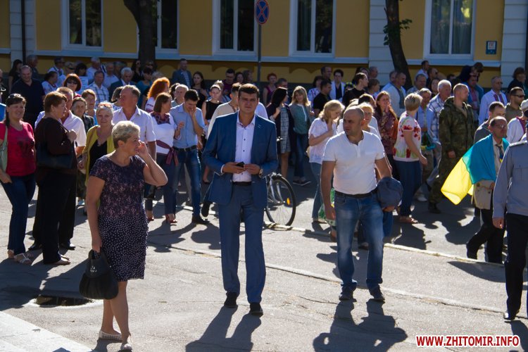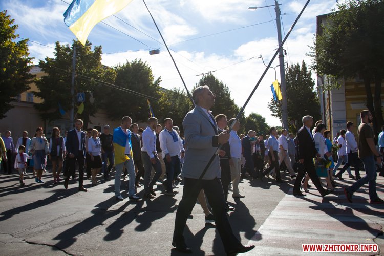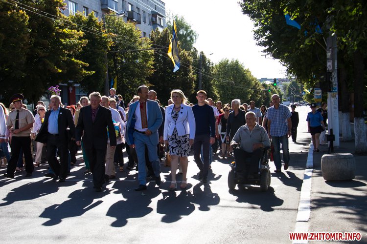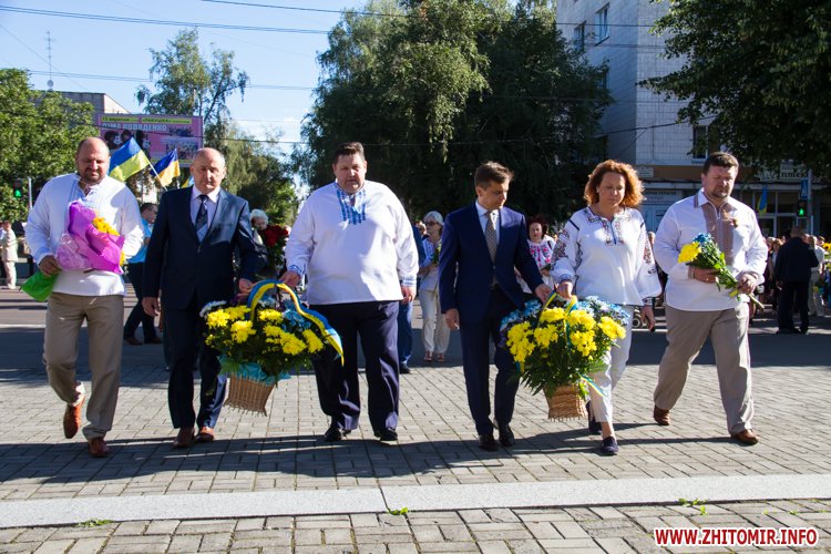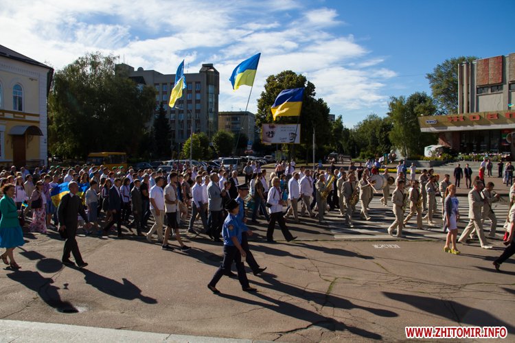 Кілька сотень людей пройшли по Великій Бердичівській від пам’ятника Тарасу Шевченку до майдану Корольова, де хвилиною мовчання вшанували пам'ять загиблих два роки тому під Іловайськом. У святковій колоні не було перших осіб області - від облдержадміністрації були заступники губернатора Ігор Гундитч та Ярослав Лагута, а обласну раду представляв перший заступник Володимир Ширма. У святковій колоні також був народний депутат від Житомира Борислав Розенблат.