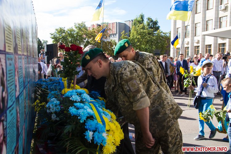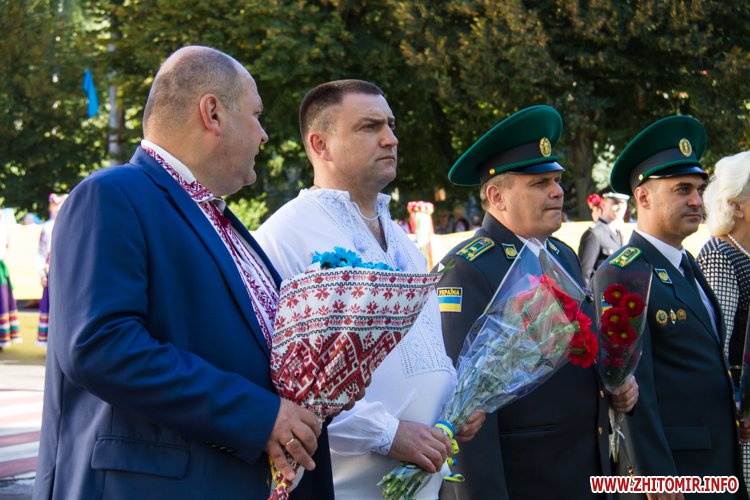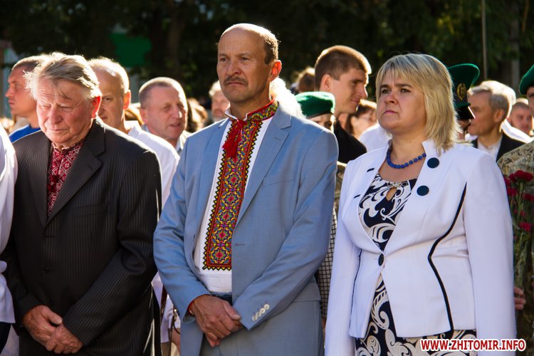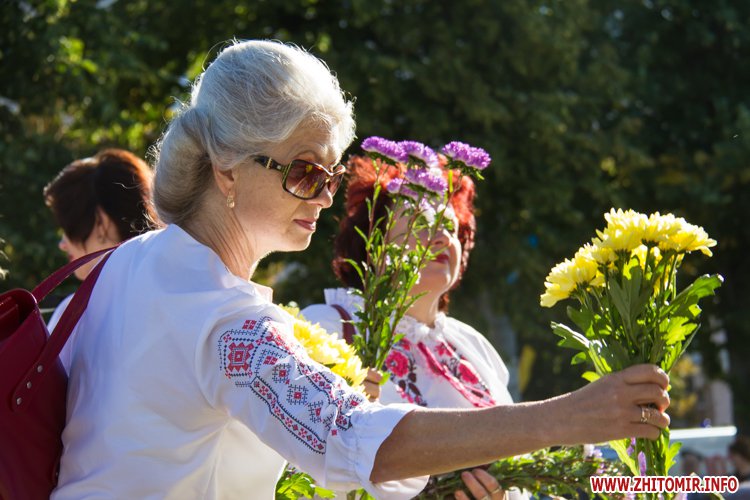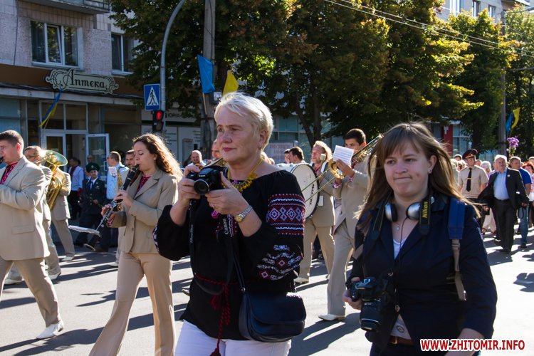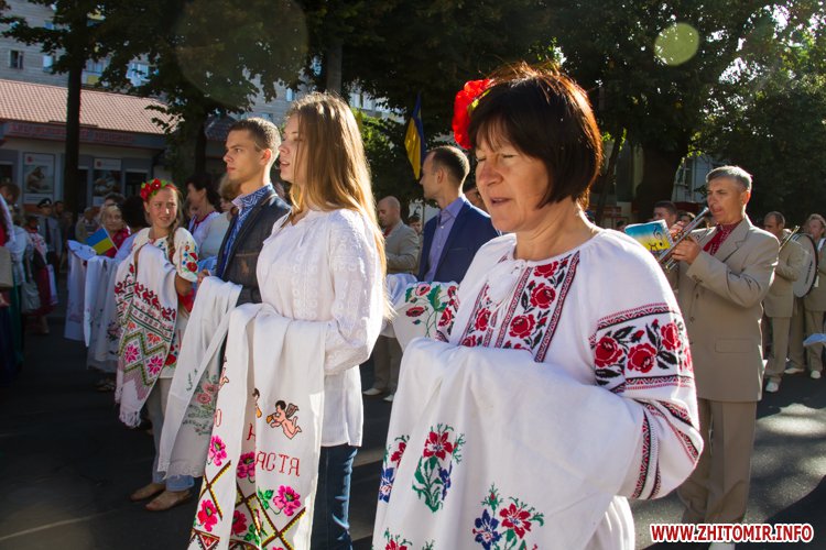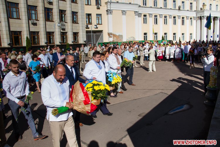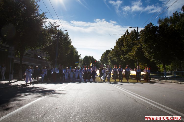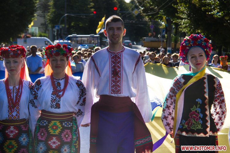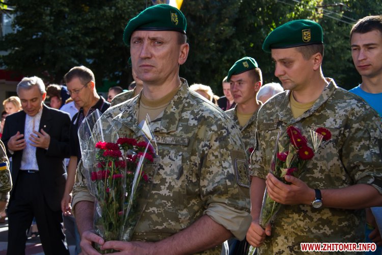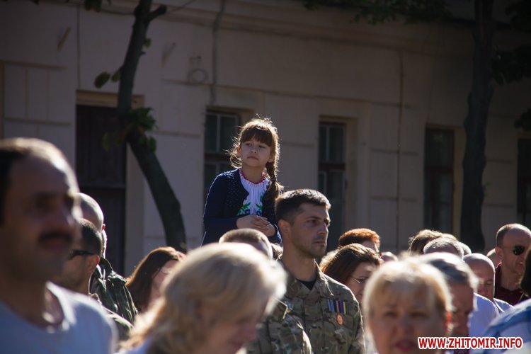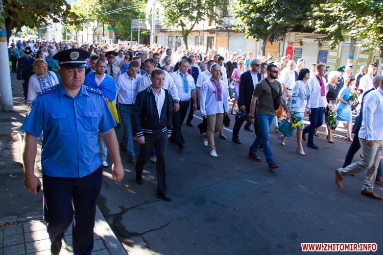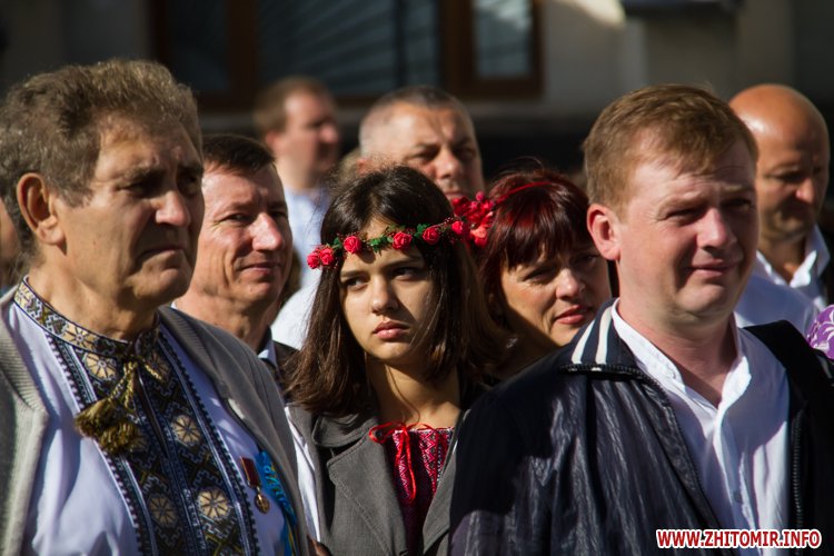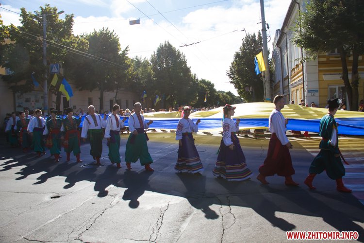 Кілька сотень людей пройшли по Великій Бердичівській від пам’ятника Тарасу Шевченку до майдану Корольова, де хвилиною мовчання вшанували пам'ять загиблих два роки тому під Іловайськом. У святковій колоні не було перших осіб області - від облдержадміністрації були заступники губернатора Ігор Гундитч та Ярослав Лагута, а обласну раду представляв перший заступник Володимир Ширма. У святковій колоні також був народний депутат від Житомира Борислав Розенблат.