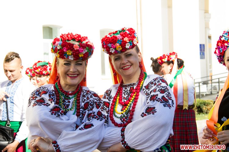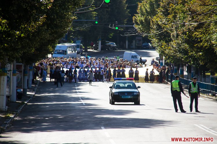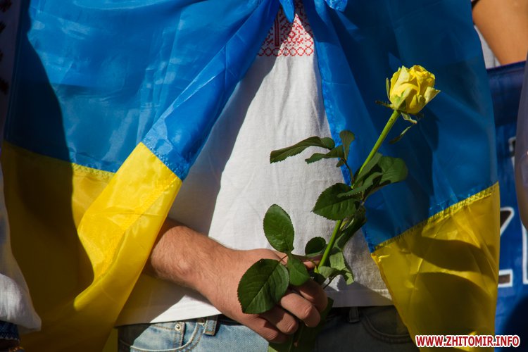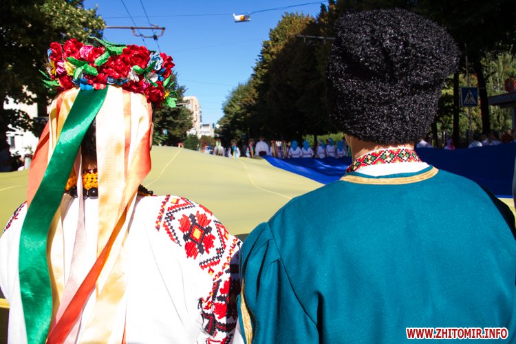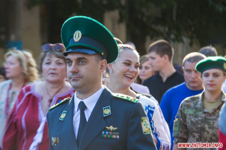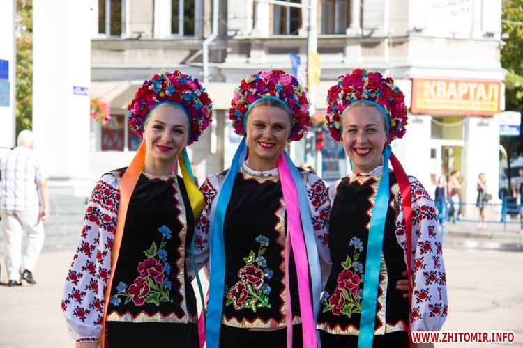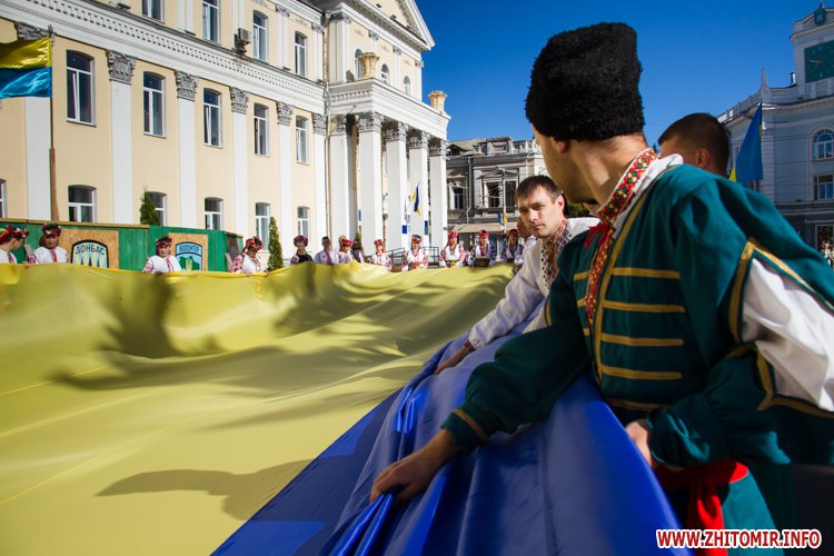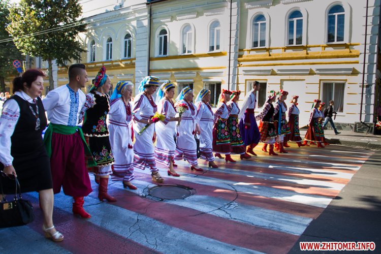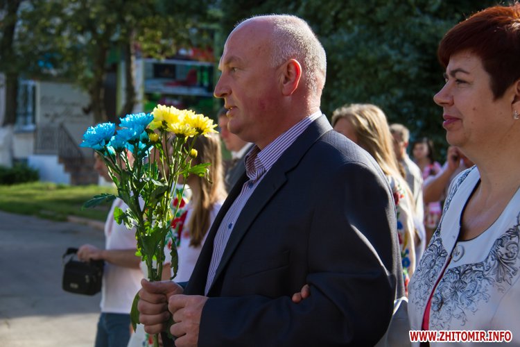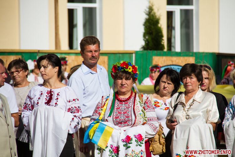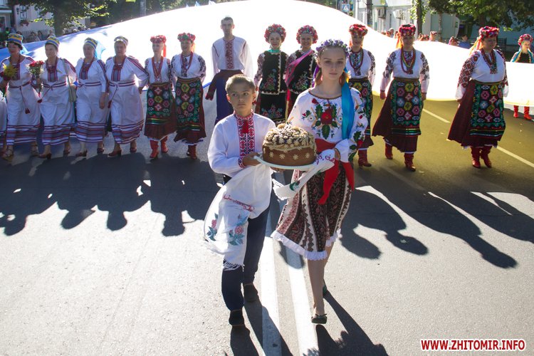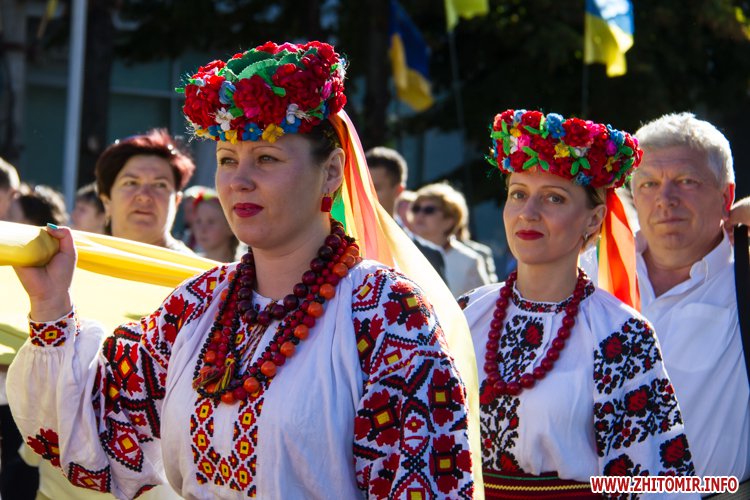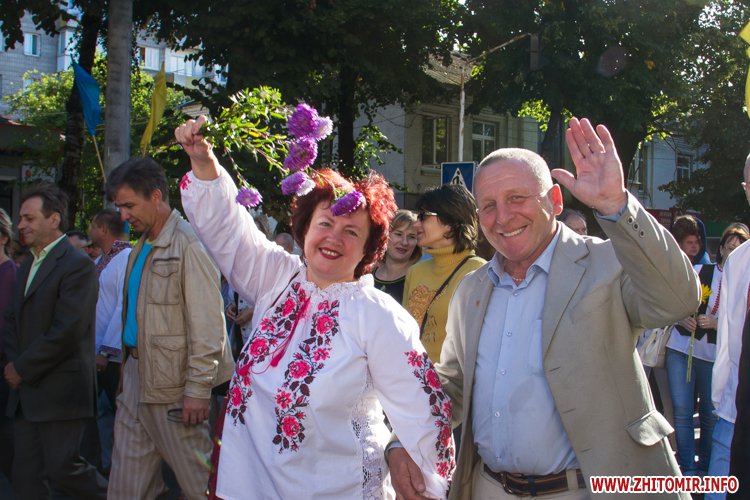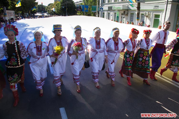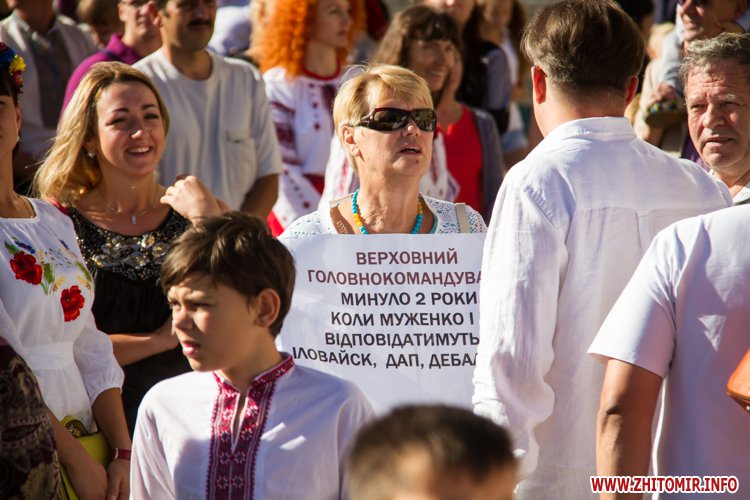 Кілька сотень людей пройшли по Великій Бердичівській від пам’ятника Тарасу Шевченку до майдану Корольова, де хвилиною мовчання вшанували пам'ять загиблих два роки тому під Іловайськом. У святковій колоні не було перших осіб області - від облдержадміністрації були заступники губернатора Ігор Гундитч та Ярослав Лагута, а обласну раду представляв перший заступник Володимир Ширма. У святковій колоні також був народний депутат від Житомира Борислав Розенблат.