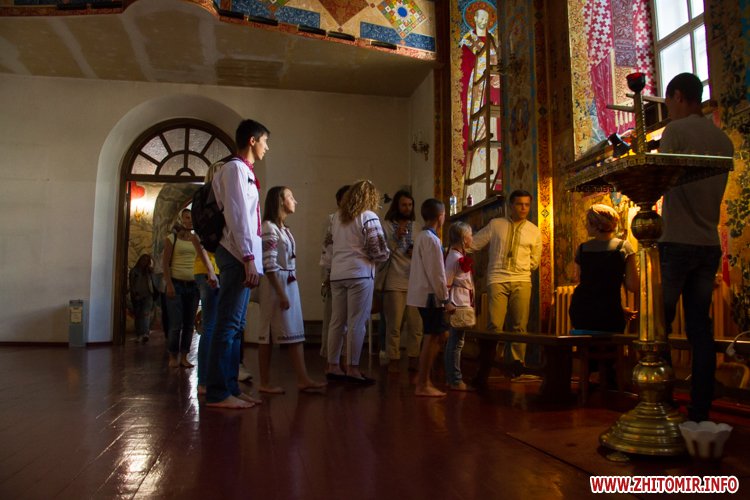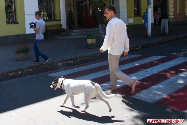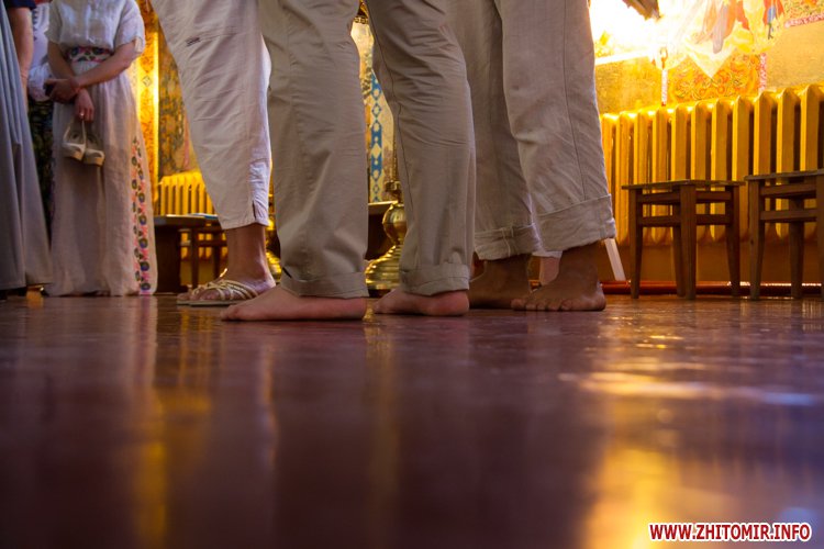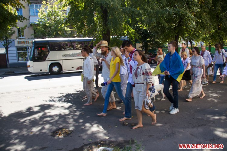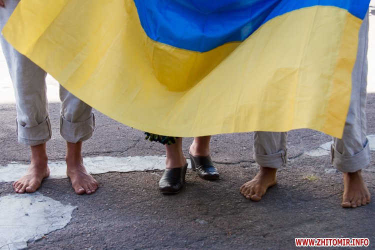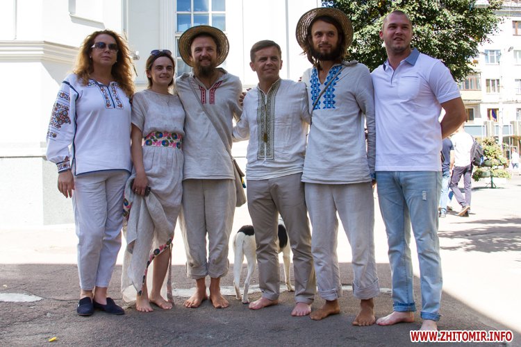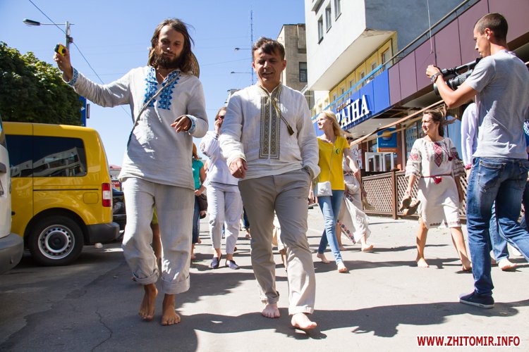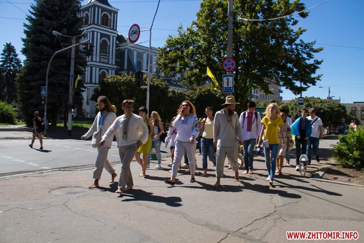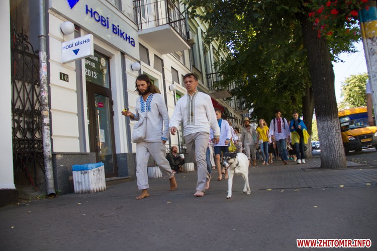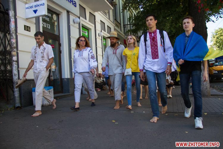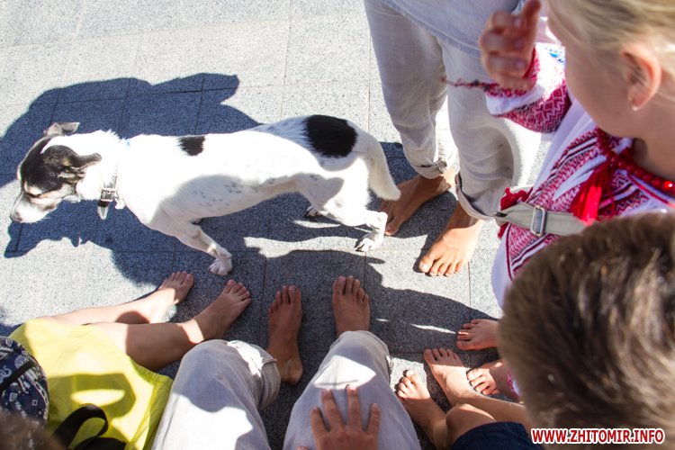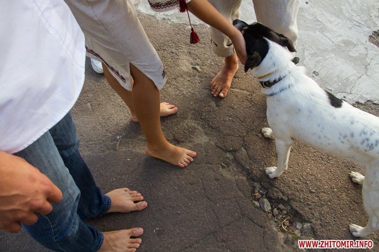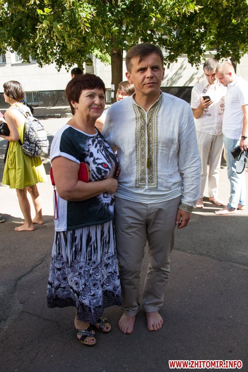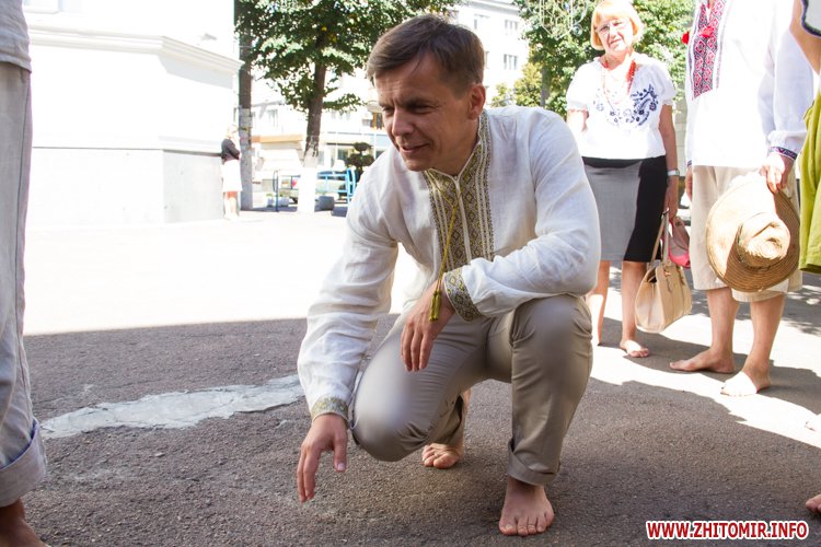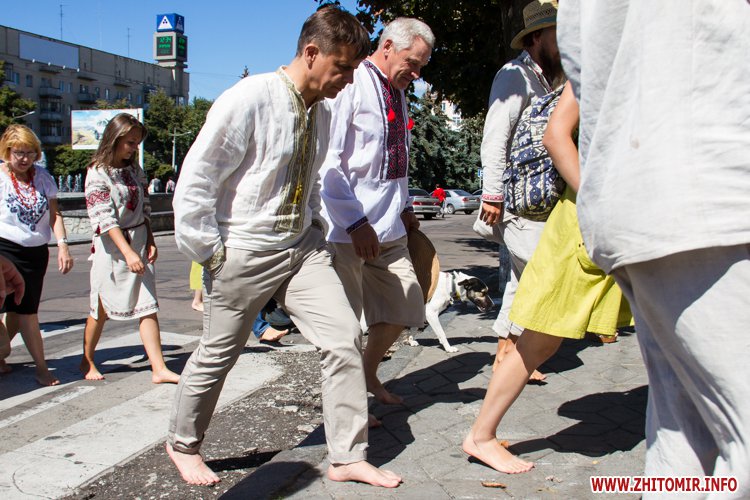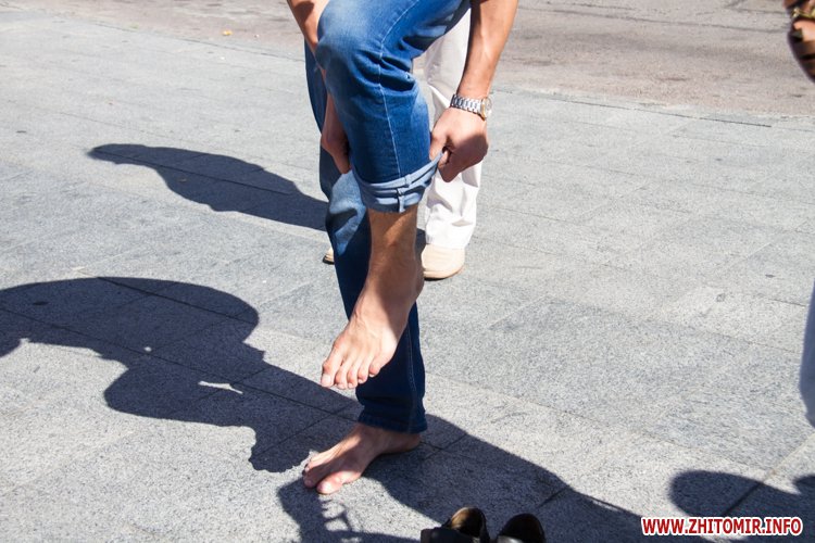 Около часа дня несколько десятков человек босиком прошли от фонтана возле площади Соборной до улицы Михайловская. Сергей Сухомлин, как и обещал накануне, был босиком, а вот секретарь горсовета Наталия Чиж разуться не рискнула, хотя и шла вместе с участниками флешмоба. По дороге босые люди зашли в Михайловский собор, а потом мэр пригласил гостей Житомира на обед в «Львівську браму» на Михайловской.