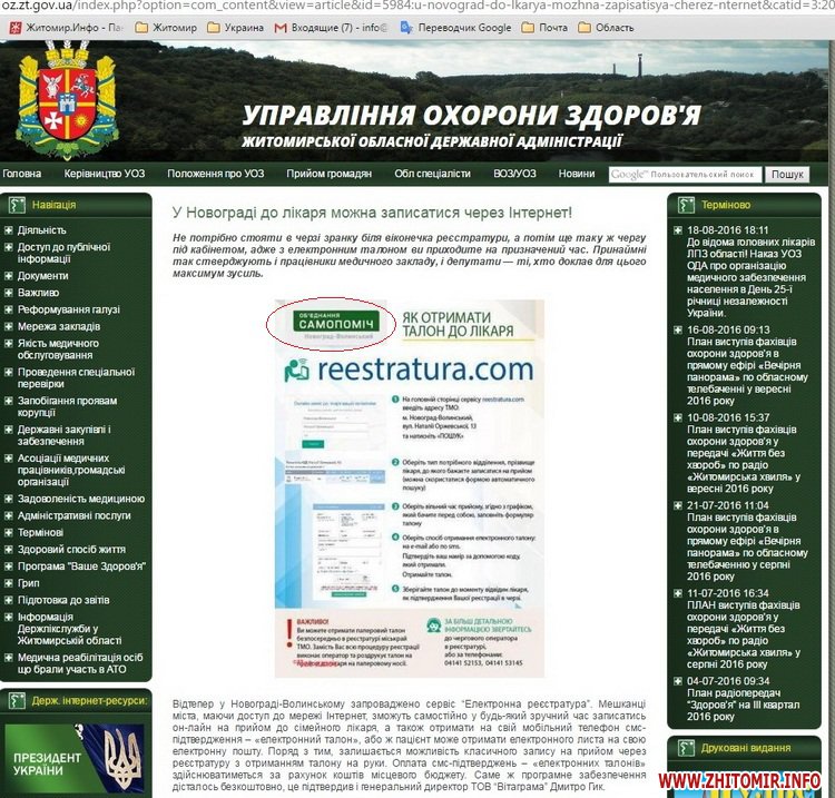 26 серпня на сайті управління охорони здоров’я Житомирської облдержадміністрації з’явилася інформація про запис до лікаря у Новограді-Волинському через інтернет. На афіші, яка також була опублікована на сайті, у верхньому лівому кутку видно логотип об’єднання «Самопоміч», але жодної згадки про причетність партії Андрія Садового до впросадження сервісу на сайті управління немає.