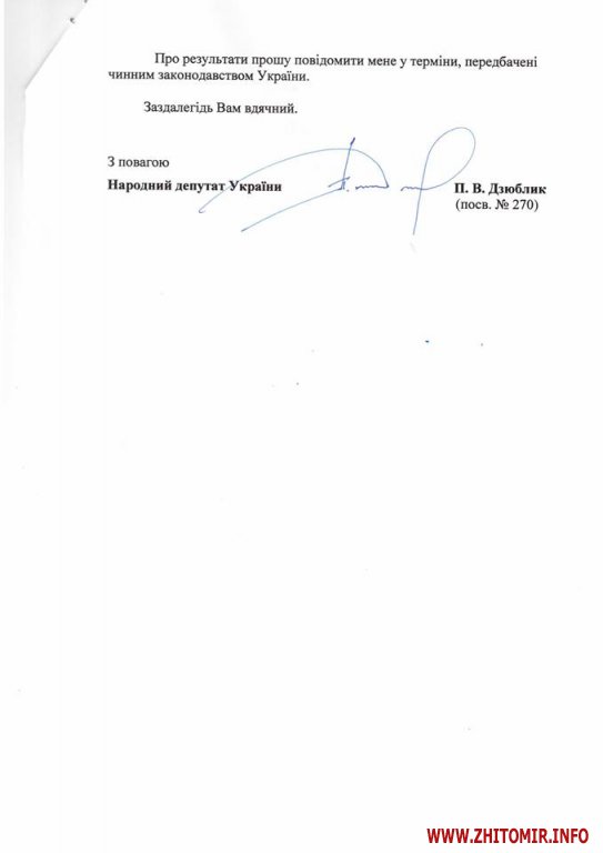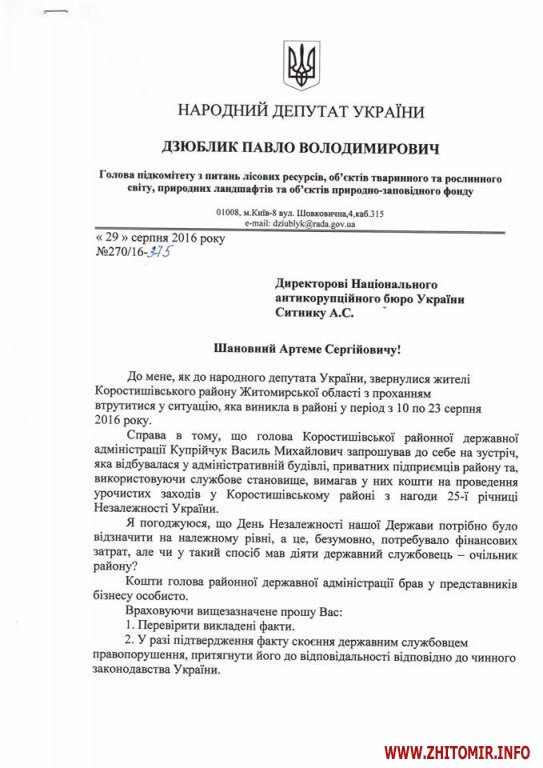 Народний депутат від Житомирської області Павло Дзюблик (фракція «Народний фронт») звернувся до голови Національного антикорупційного бюро України з проханням розібратися у ситуації в Коростишівському районі.