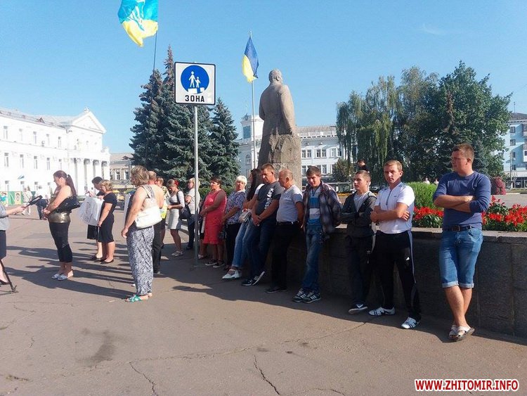 Люди стоять з плакатами «Поверніть школі ІІ ступінь». Мітингувальники збираються йти до т. в.о. голови Житомирської ОДА Ігора Гундича і просити, щоб їх школу не закривали, а якщо реорганізації уникнути не можна, то проситимуть надати нормальний транспорт, щоб діти добирались до іншої школи.