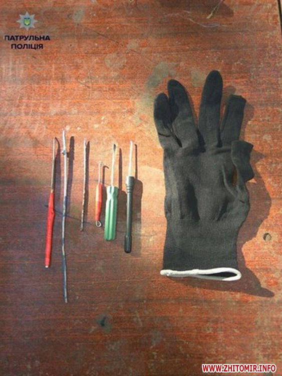 «Сьогодні, близько 8-ї години ранку, одразу після початку денного чергування, патрульні поліцейські 4-ї роти помітили біля під’їзду одного з будинків по вулиці Космонавтів підозрілого юнака. Хлопець, побачивши патрульних, різко змінив напрямок руху, намагаючись сховатися у підвальному приміщенні. Проте поліціанти вистежили юнака. В ході поверхневої перевірки у 16-ти річного житомирянина патрульні знайшли 6 металевих предметів, ззовні схожі на відмички, та перчатку чорного кольору. Також патрульні виявили пакет, всередині якого знаходилися джинси і кофта з капюшоном. Ймовірно, хлопець після вчинення правопорушення переодягався у змінний одяг», - йдеться у повідомленні.