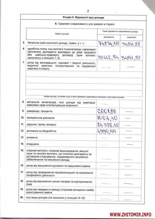 Доходы нового начальника управления капитального строительства в 2015 году составили 74 тыс. 834,35 грн, из которых: 38 тыс. 442,84 грн – зарплата; 6 тыс. 601,86 грн – дивиденды; 1 тыс. 67,30 грн – материальная помощь; 24 тыс. 326,40 грн – подарки, призы, выигрыши; 4 тыс. 359,95 грн – помощь по безработице. Дходи членов семьи (жена и две дочери) составили 34 тыс. 841,88 грн – зарплата.