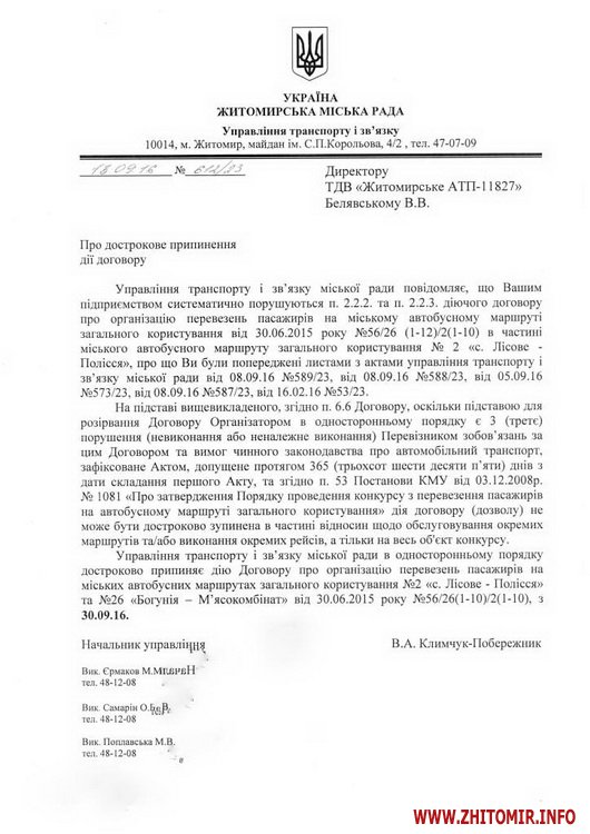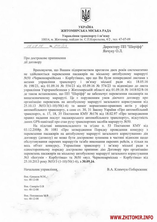 Управління транспорту та зв’язку Житомирської міської ради в односторонньому порядку розриває угоди з двома перевізниками на маршрути 2 і 26, 3 і 50.