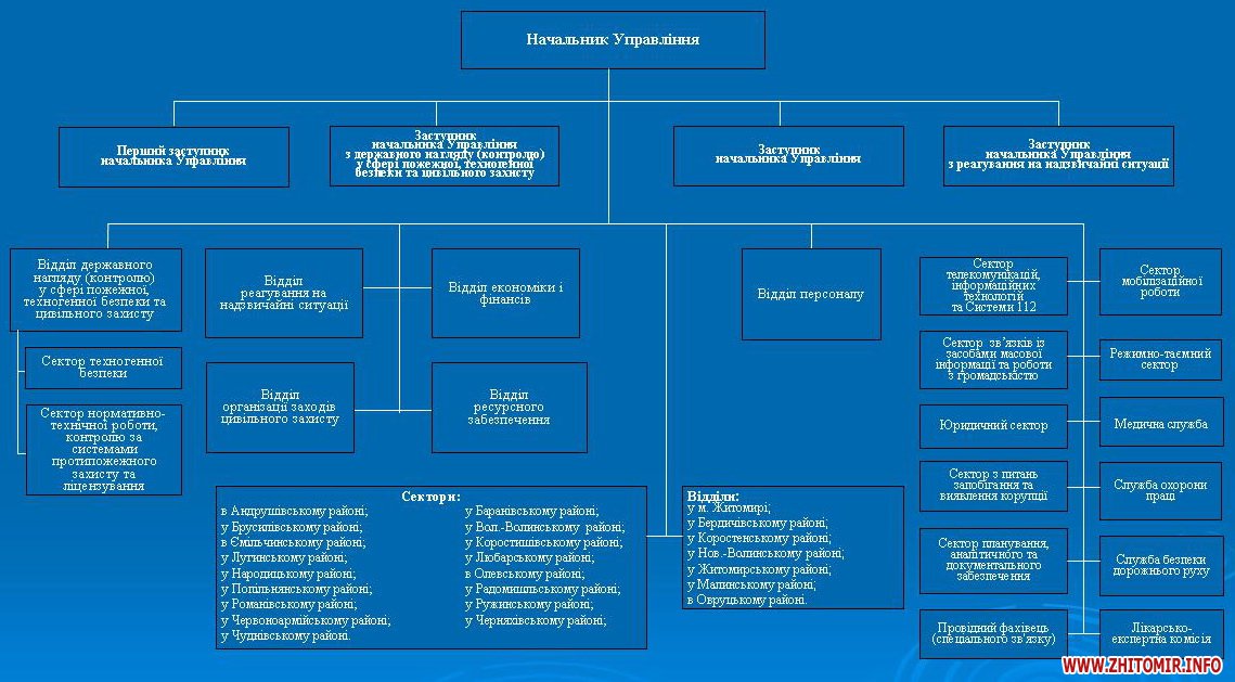 Сегодня у начальника управления ГСЧС в Житомирской области Игоря Никитчука есть четыре заместителя. В области действуют 17 секторов ГСЧС в районах и 7 отделений – в районах и г.Житомире.