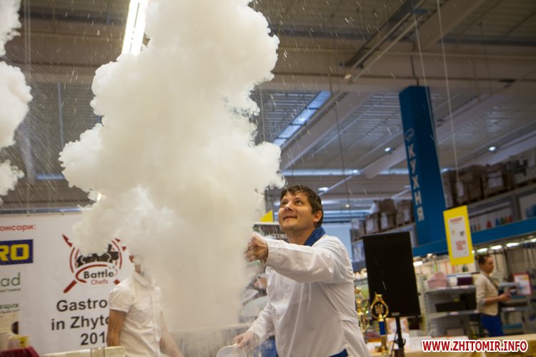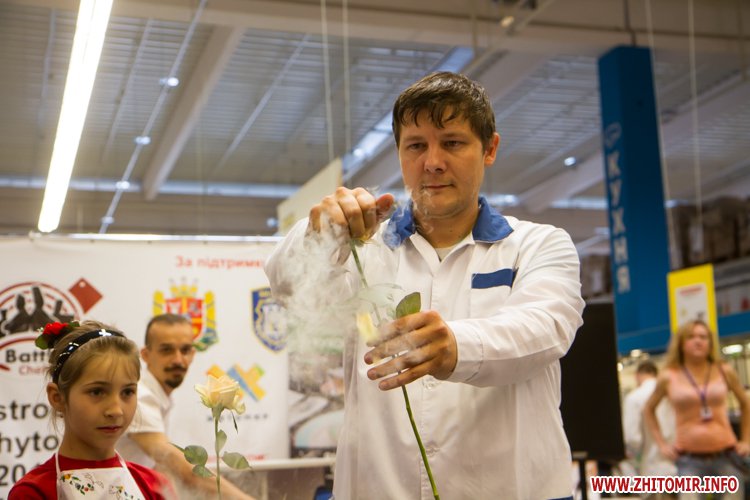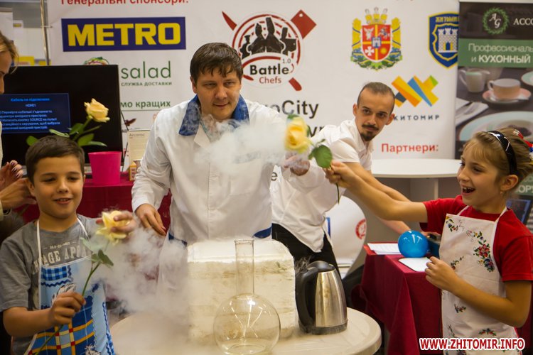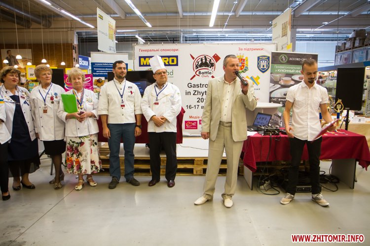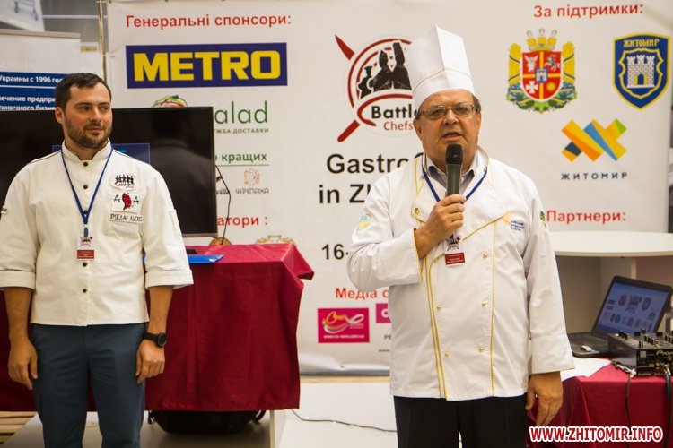 У Житомирі 16 вересня звершився перший день обласного чемпіонату з кулінарного мистецтва і сервісу «Battle Chefs 1.0». Протягом дня у центрі оптової торгівлі «МЕТРО» близько сотні професійних кухарів, студентів спеціалізованих начальних закладів та офіціанти змагалися за кубки голови Житомирської ОДА та мера Житомира.