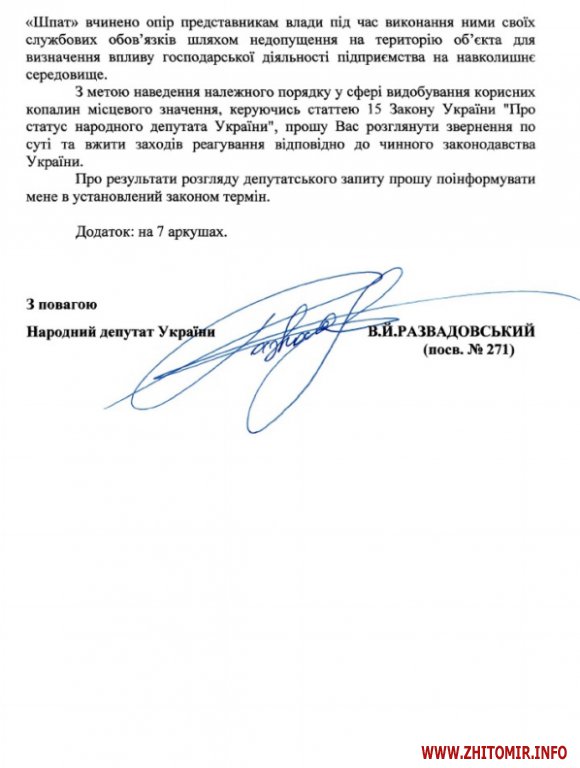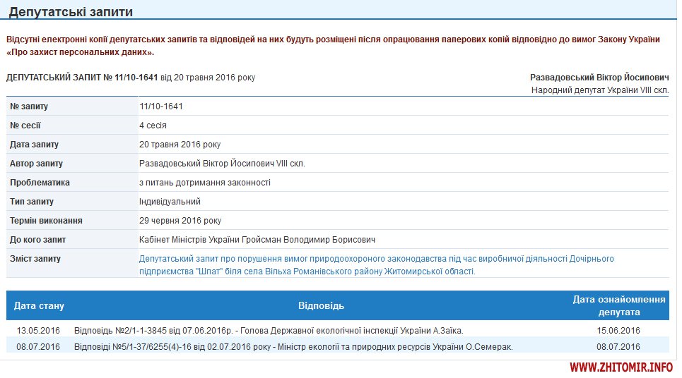 На сайті Верховної Ради є інформація, що нардеп-мажоритарник від Житомирської області Віктор Развадовський в травні цього року надсилав запит прем’єр-міністру Володимиру Гройсману щодо порушення вимог природоохороного законодавства під час виробничої діяльності Дочірнього підприємства «Шпат» біля села Вільха Романівського району Житомирської області. Развадовський отримав відповіді від голови Держекоінспекції і міністра екології та природних ресурсів, але самі листи відповіді на парламентському сайті не опубліковані.