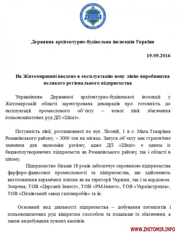 Управлінням Державної архітектурно-будівельної інспекції у Житомирській області зареєстрована декларація про готовність до експлуатації промислового об’єкту – нової лінії збагачення польовошпатових руд ДП «Шпат».
