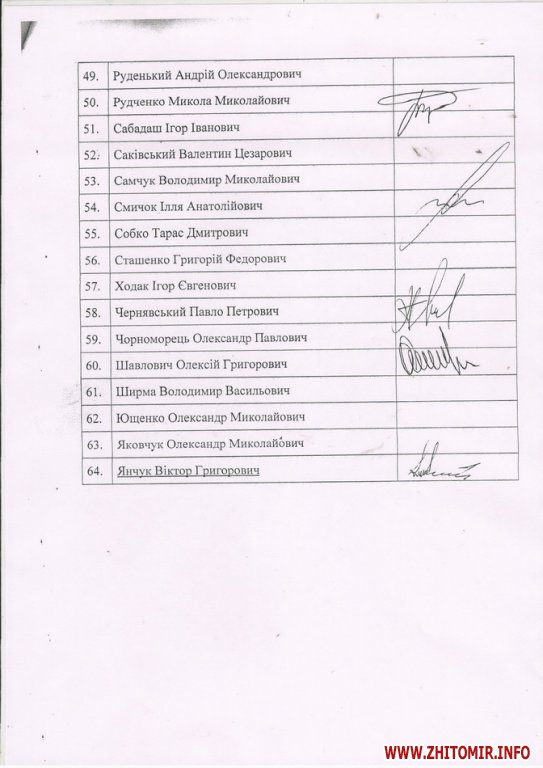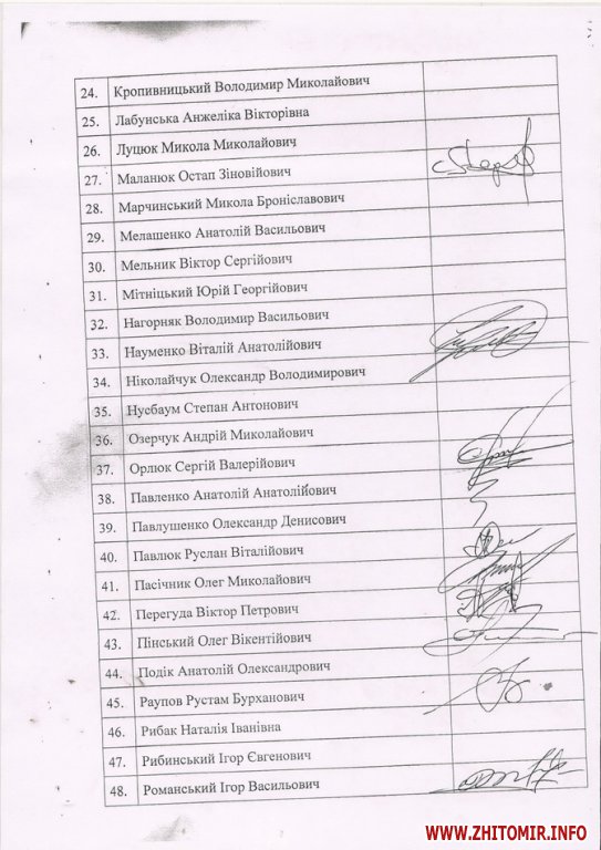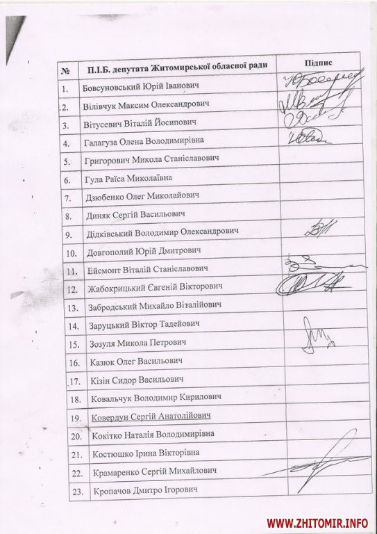У розпорядженні Житомир.info є копії підписів депутатів за скликання позачергової сесії: підтримали пропозицію представники крім «Самопомочі» також депутати фракцій Блоку Петра Порошенка, «УКРОП», ВО «Свободи», Радикальної партії Олега Ляшка, Народної партії та один представник ВО «Батьківщина» - Сергій Орлюк.