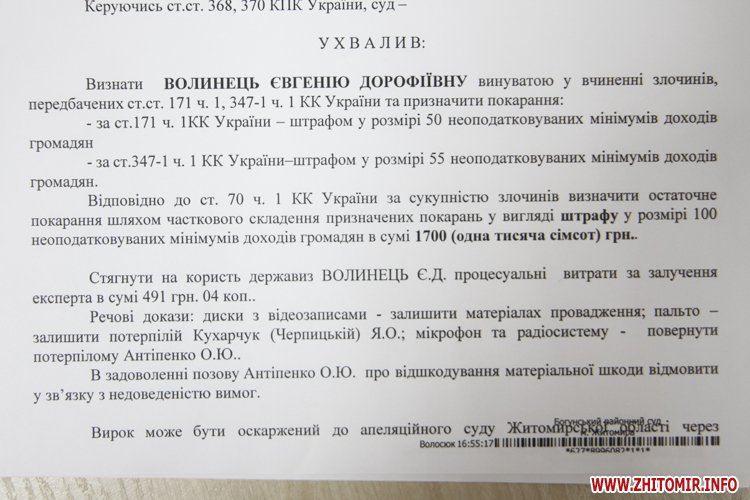 «Визнати Волинець Євгенію Дорофіівну винуватою у вчиненні злочинів, передбачених ст.ст.171 ч.1, 347-1 ч.1 КК України та призначити покарання: за ст.171 ч.1 КК України – штрафом у розмірі 50 неоподатковуваних мінімумів доходів громадян; за ст.347-1 ч.1 КК України – штрафом 55 неоподатковуваних мінімумів доходів громадян. Відповідно до ст.70 ч.1 КК України за сукупністю злочинів визначити остаточне покарання шляхом часткового складення призначених покарань у вигляді штрафу у розмірі 100 неоподатковуваних мінімумів доходів громадян в сумі 1700 (одна тисяча сімсот) грн. Стягнути на користь держави з Волинець Є.Д. процесуальні витрати за залучення експерта в сумі 491 грн 04 коп. Речові докази: диски з відеозаписами – залишити у матеріалах провадження; пальто – повернути потерпілій Кухарчук (Черпицькій) Я.О.; мікрофон та радіосистему – повернути потерпілому Антипенко О.Ю», - зазначається в ухвалі суду.