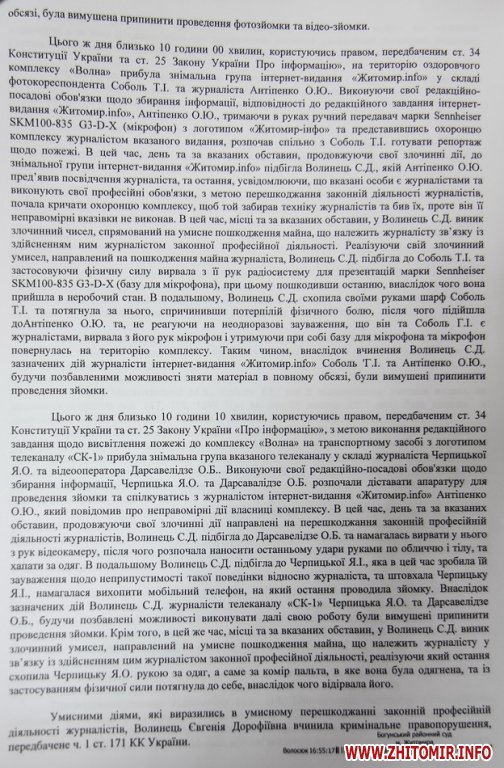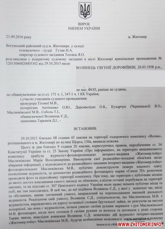 Як повідомляв Житомир.info, 29 жовтня 2015 року Євгенія Волинець з лайкою накинулася на житомирських журналістів, які приїхали знімати пожежу у розважальному комплексі «Волна». 29 січня процес розслідування правоохоронці завершили і направили до суду обвинувальний акт. 8 лютого перше судове засідання по справі перешкоджання діяльності журналістів не відбулося. На друге засідання власниця готельно-оздоровчого комплексу «Волна» знову не з’явилася, але прийшла на третє - 11 березня.