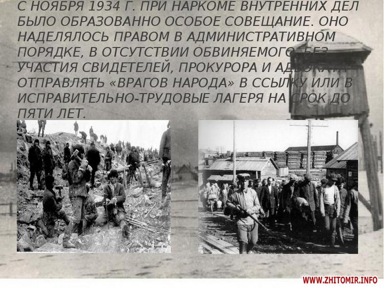 Ключова етнічна особливість Житомира і нашої області – це багатонаціональність. Саме тому на початку 1930-х сталінський режим запровадив тут масові репресивні операції за етнічною ознакою – переселення сімей поляків і німців із прикордонних районів. Відтак житомирські чекісти на початок Великого терору 1937-38 вже мали значний каральний досвід, напрацьовані форми і методи і визначили категорії майбутніх жертв. Серед них опинилися робітники і селяни, представники інтелігенції, всіх національностей і релігійних конфесій, ті, хто раніше входив до різних партій і громадських організацій.