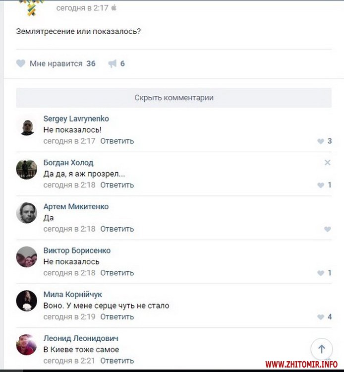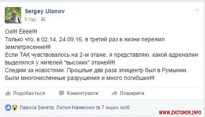 Цієї ночі, 24 вересня, в Україні відчувалися земляні поштовхи, які сягали до 6 балів за шкалою Ріхтера. Поштовхи відчували не тільки мешканці Житомира, а й інших міст області.