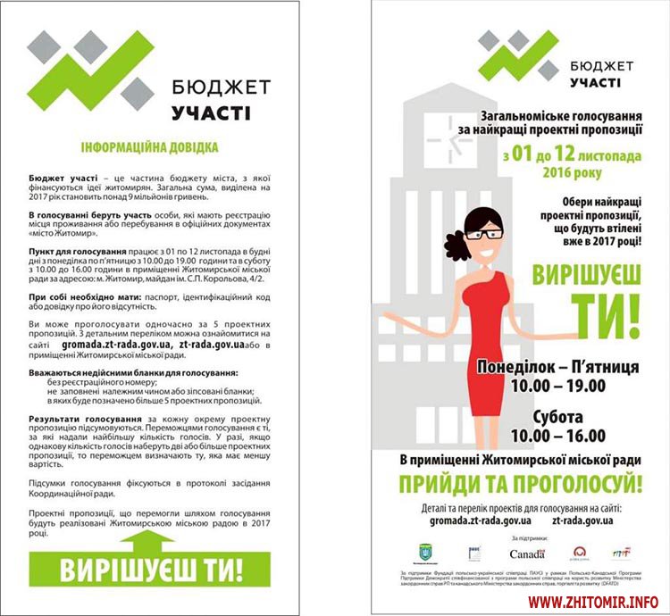 «Пункт для голосування працюватиме у приміщенні Житомирської міської ради (перший поверх, фойє) з понеділка по п’ятницю з 10:00 до 19:00 і в суботу з 10:00 до 16:00. Деталі та перелік проектів для голосування на сайті gromada.zt-rada.gov.ua. У голосуванні можуть брати участь особи, які мають реєстрацію місця проживання або перебування в офіційних документах «місто Житомир». При собі необхідно мати: паспорт, ідентифікаційний код або довідку про його відсутність. Віддати свій голос можна одночасно за п’ять проектних пропозицій», – йдеться у повідомленні.