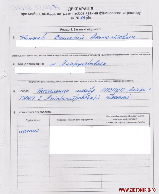 Зарплата капитана Валерия Бондаря, который сейчас возглавляет криминальную полицию ГУНП, в 2015 году составляла 76 тыс. 825,04 грн, а его мать заработала 12 тыс.грн, других источников доходов у семьи нет. Недвижимости у капитана нет, а матери принадлежит квартира общей площадью 62,1 кв.м. У Валерия Бондаря есть автомобиль Chevrolet Aveo 2011 г.в., купленный за 106 тыс.грн, у членов семьи – Mercedes ML 350 2008 г.в. Вкладов в банках и финансовых обязательств.