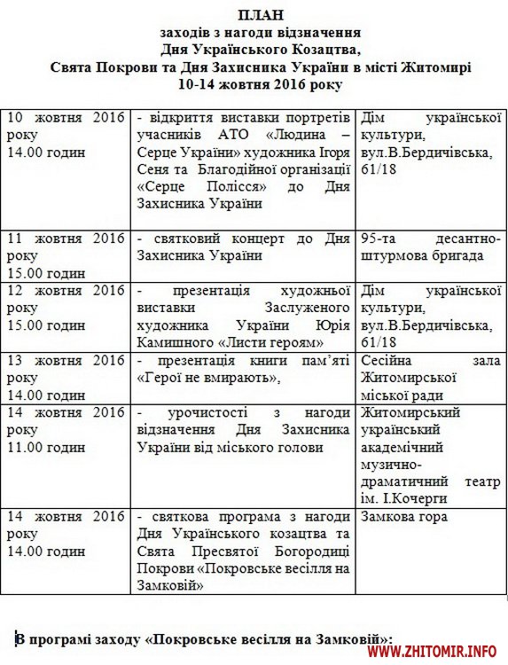 1. Організувати та провести 10 - 14 жовтня 2016 року відзначення Дня Українського козацтва, Свята Покрови та Дня Захисника України в місті Житомирі.
