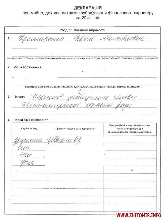 Сергей Крамаренко с января прошлого года работал в Лугинской райгосадминистрации, в частности – с апреля по ноябрь был первым заместителем Олевской РГА. Доходы Крамаренко за 2015 год составляют 48 тыс. 840 грн – зарплата. Доходы членов семьи (жена, два сына и дочь) поставили 352 тыс. 167 грн – зарплата. В биографии первого заместителя председателя облсовета указано, что он пребывает в гражданском браке, жена – Шворян Елена Владимировна, работает менеджером в ООО «Ювелир Украины».