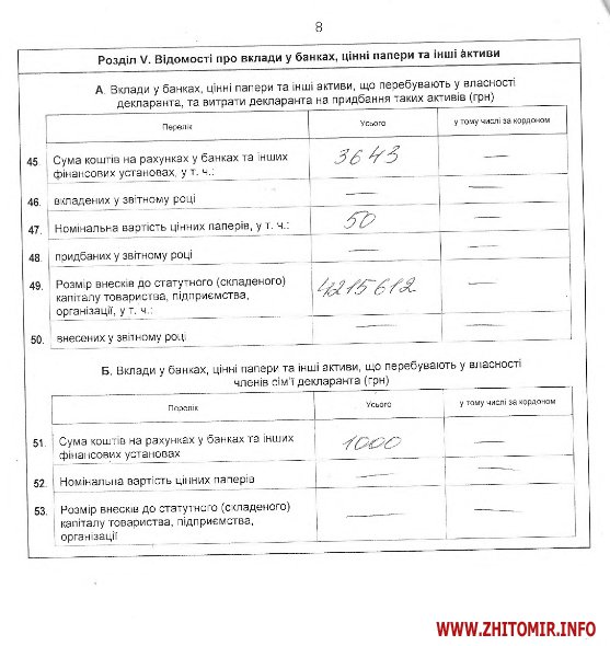 На банковских счетах Крамаренко – 3 тыс. 643 грн, номинальная стоимость принадлежащих ему ценных бумаг – 50 грн, размер взносов в уставной фонд предприятий – 4 млн 215 тыс. 612 грн. У членов семьи на счетах в банках находится 1 тыс.грн.