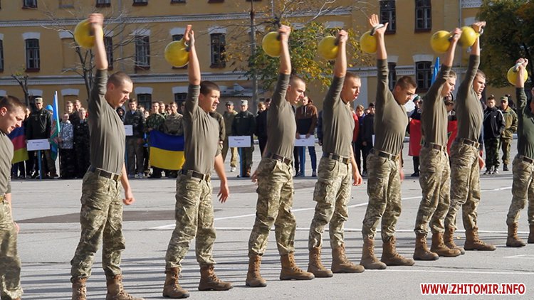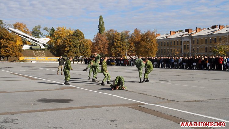 Близько двохсот учасників вишукувалися на стройовому плацу Житомирського військового інституту, аби взяти участь у V Спартакіаді з військово-патріотичного виховання серед школярів. Урочистості традиційно розпочалися підняттям державного прапора. Не обійшлося і без показових виступів курсантів інституту.