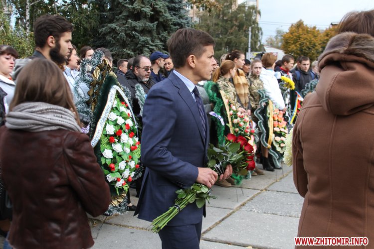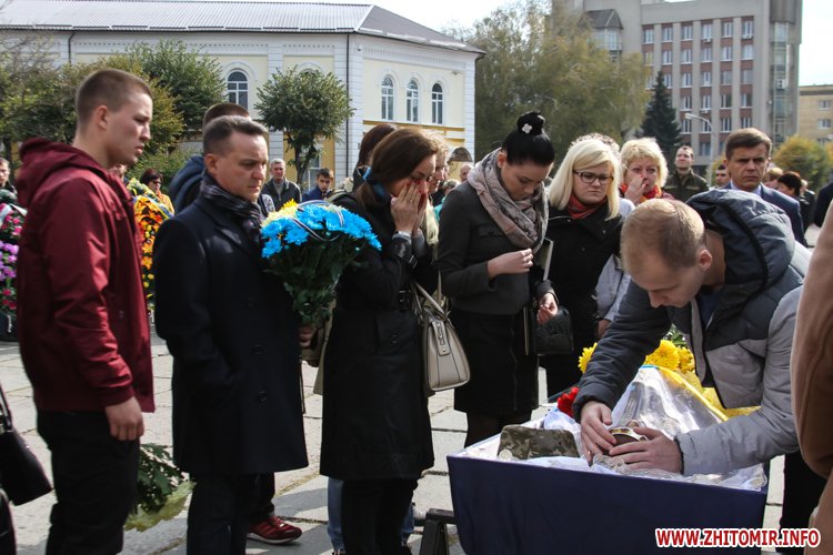 Близько 13 години тіло бійця у відкритій домовині привезли під стіни облдержадміністрації. На церемонії прощання були присутні рідні, знайомі та друзі Віталія, деякі посадовці та небайдужі житомиряни.