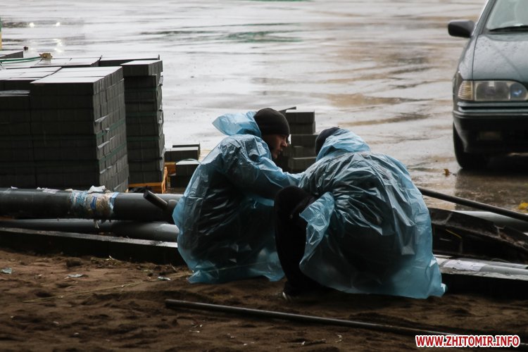 10 жовтня у Житомирі на майдані Соборному триває реконструкція тротуарів. Навіть дощ не заважає робітникам працювати.