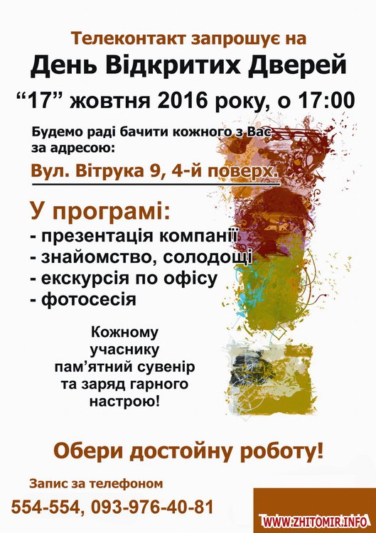 Телеконтакт Один из первых call-центров умудрился быстро развиться и открыть кучу филиалов не только в Украине, но и за рубежом. В 2011-м году открылись в Житомире. На данный момент нехилый офис: на Витрука 9. Предпосылок к закрытию не видно: как показывает практика, в кризисные времена аутсорсинговые call-центры показывают бурный рост. А поскольку Телеконтакт как раз из таких, то остается только позавидовать этому островку стабильности. Сейчас в житомирском Телеконтакте трудится более 600 человек. Такие дела.