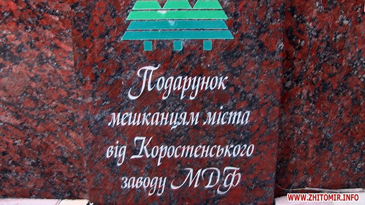 «Завод хоче для міста створити якнайкращі умови проживання, праці. Тому, у зв’язку з цими питаннями, які виникли на нашій площі – це тут був споруджений пам’ятник Леніну. Його було демонтовано і ми запропонували, що ми побудуємо за свої власні кошти фонтан – музичний, кольоровий, досить приємний для всіх. Тут якраз знаходиться завжди молодь, дітки, дорослі люди, прохідне місце і всім це подобається», – зазначає фінансовий директор ПрАТ «Коростенський завод МДФ» Катерина Самчук.