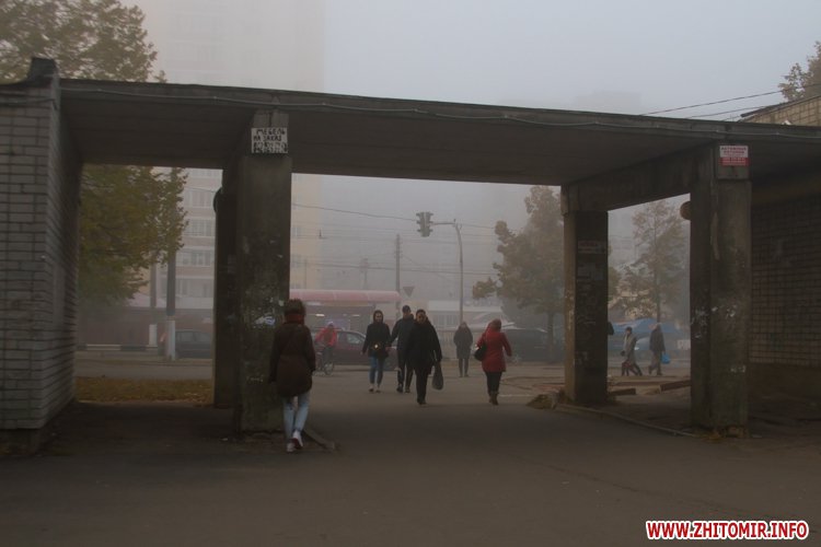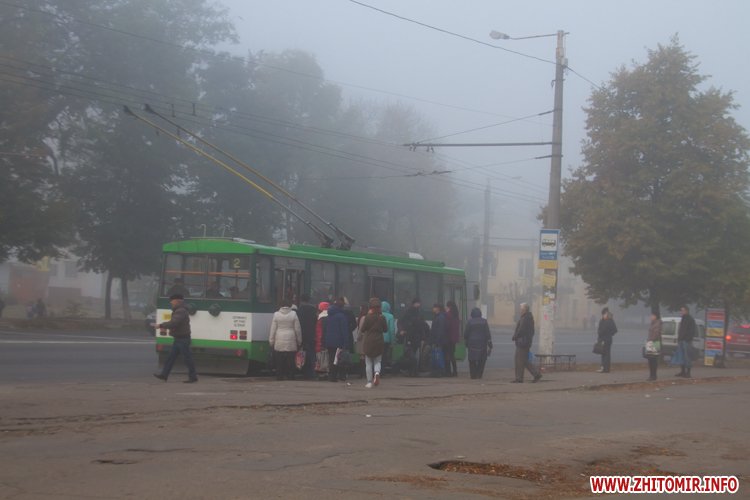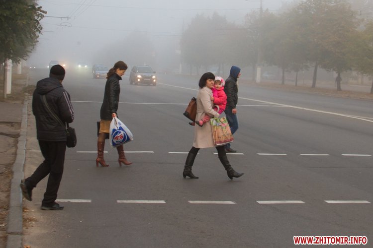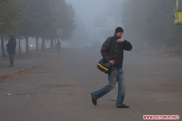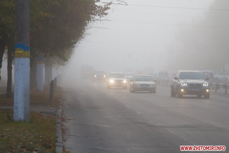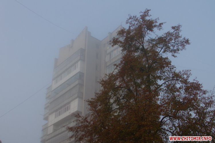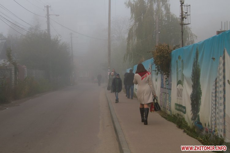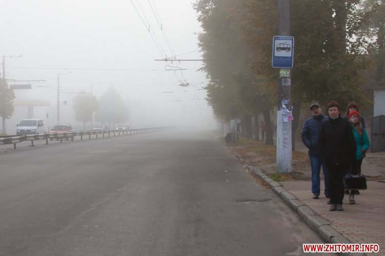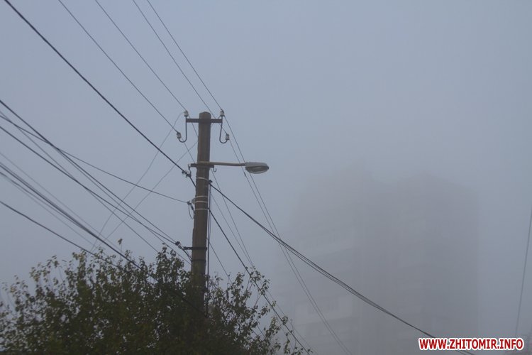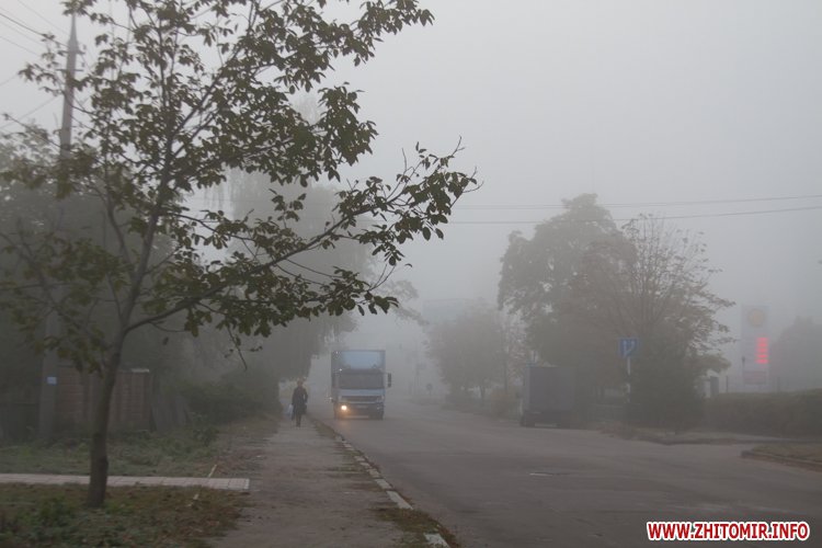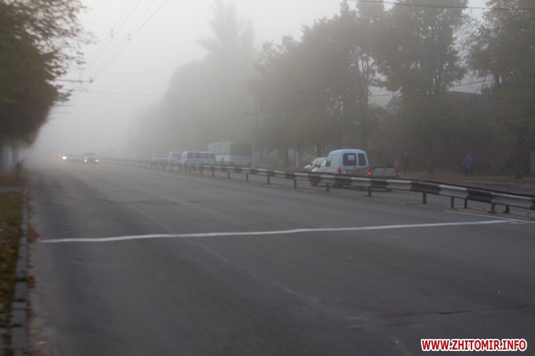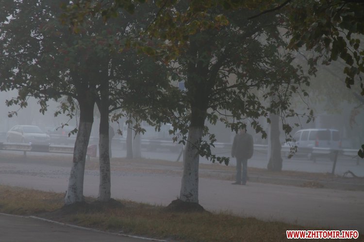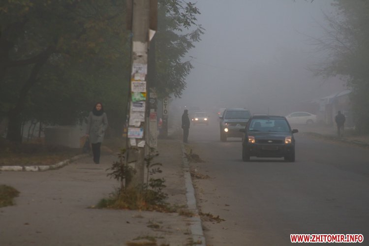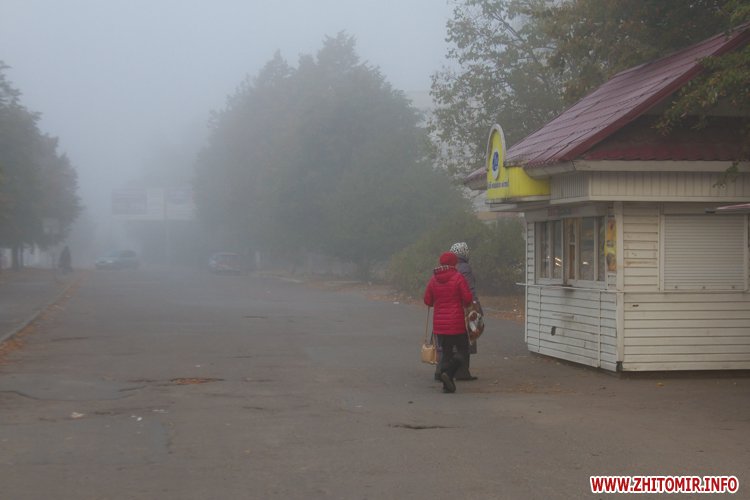 У ніч на 17 жовтня в Житомирі спостерігалися незначні заморозки (до -3 градусів), а вранці місто накрив туман. Водіям доводилося їхати дуже обережно, о 7-8 годині видимість була мінімальною.
