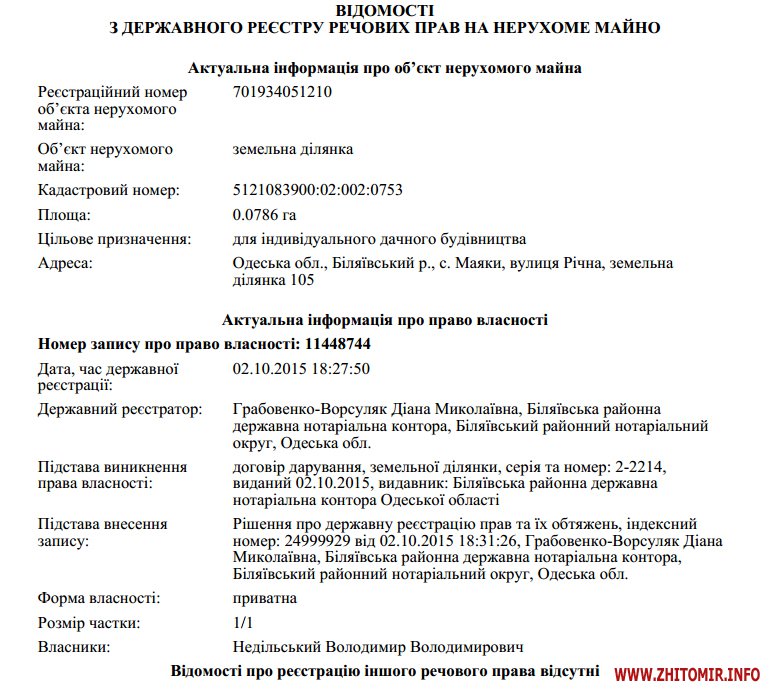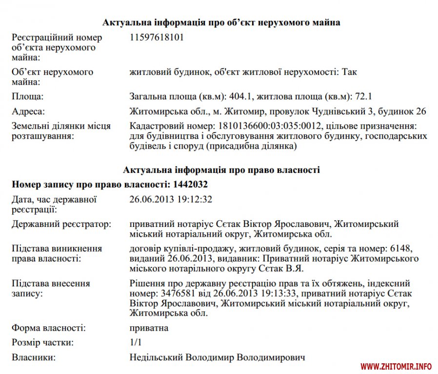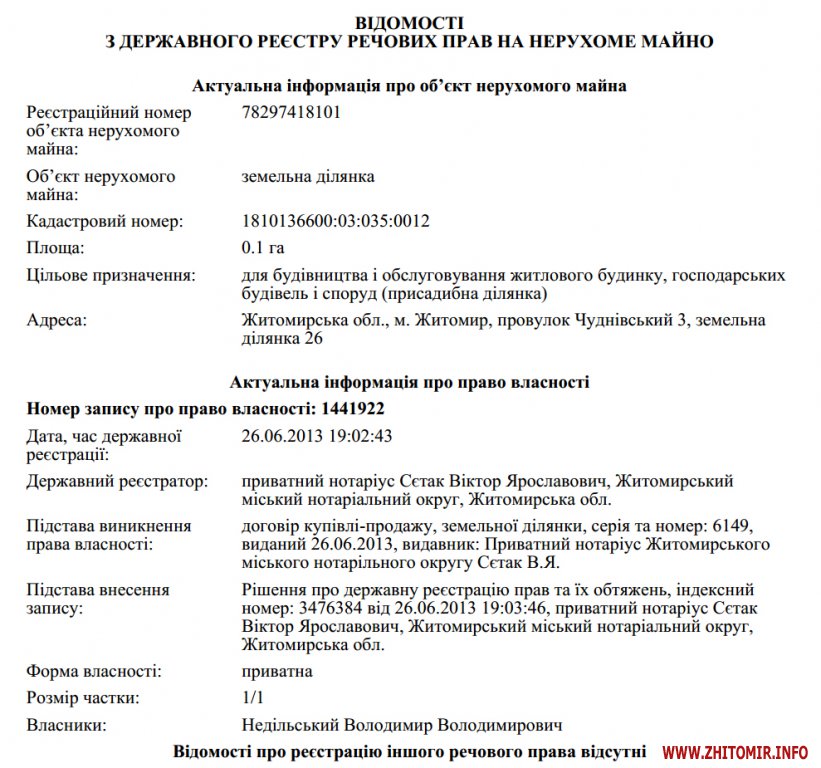 Житомир.info вирішив дізнатися, коли саме Володимир Недільський став власником землі та будинку по провулку Чуднівському та якою нерухомістю він ще володіє.